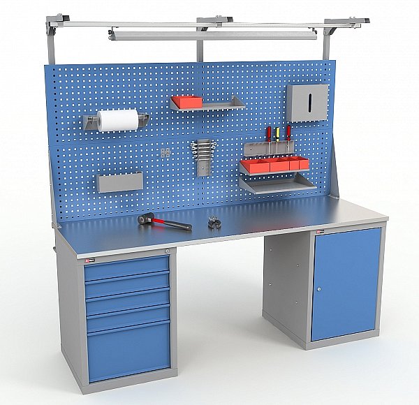 Designed for mechanical and assembly work in workshops, garages, schools, and industries. Assembled from the following modules: the tabletop is attached to leg supports or tool cabinets. Different types of perforated panels, lighting, and accessories can be installed on top.